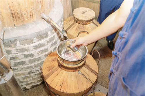 “出酒嘍!淌好酒咯!”隨著釀酒師傅一聲口號(hào),2023年頭排原酒順著甑桶的出酒口潺潺流出。